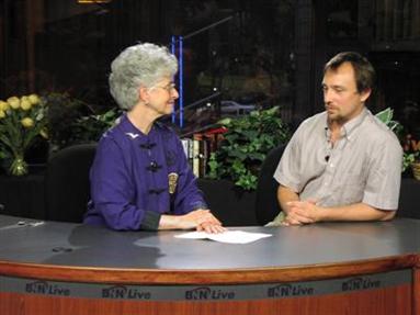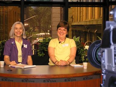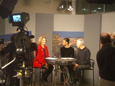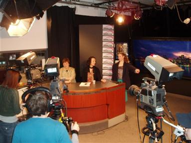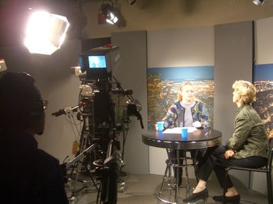 Behind-the-camera view of host Shirley Frawley with guests Rebecca Rice and Anne-Marie Cofield.